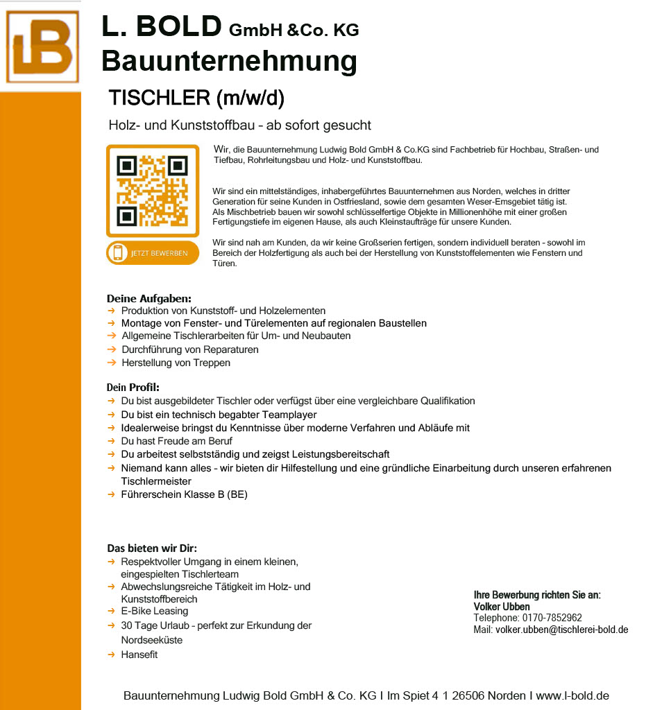 Deine Bewerbung richtest Du an: Stefan Bold Tel.: 04931/174-0 Mail:info@l-bold.de